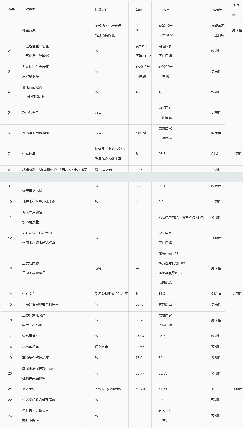 云南省“十四五”时期我国生态文明建设排头兵建设主要指标